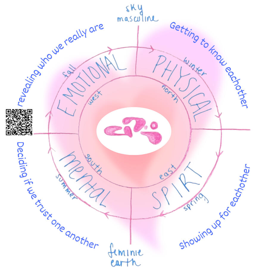 This medicine wheel is based on indigenous knowledge that I have been gifted from various people. There are medicine wheels all over the world and my first teachers were formerly incarcerated residential school survivors, Phil and Harold(Black Raven) Gatensby of the T’lingit Nation.After learning about the medicine wheel I realized it is everywhere. It is an indigenous worldview that understands all aspects of life as interconnected.In Indonesia I learned about this through “canang sari" where there are different offerings to each direction because peace has different parts to it. The medicine wheel of Dagara Nation from Burkina Faso focuses on the elemental(fire, water, earth, mineral, nature) parts of healing and wellness. The Lakota people have a similar medicine wheel as the T’lingit as well.In the many iterations of the medicine wheel its important to know that if one aspect is out of balance the rest of them are. If you are unwell mentally it impacts you physically, emotionally and spiritually. All four parts of your heart/yourself needs to be taken care of and loved for.